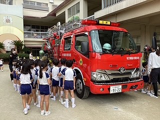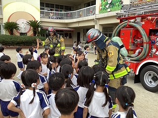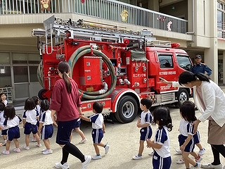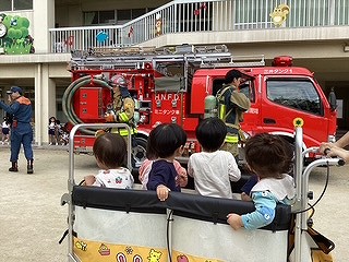 消防士の方に来ていただき、避難する姿を見て頂いたり避難する時の約束事をお話ししていただきました。大きくてかっこいい消防車を近くで見れて、大喜びの子ども達でした♪貴重な体験をさせて頂きましたね!