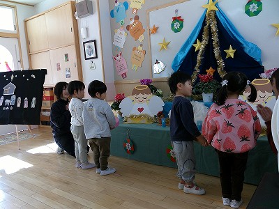 待降節の期間、子ども達は身近な人のために自分にできることを考えながら、思いやりの心を大切に育んできました。クリスマス礼拝会では赤ちゃんイエス様に歌や祈り、献金をお捧げし、喜びと感謝の気持ちに包まれた暖かなひと時を過ごすことが出来ました。