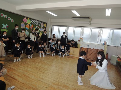 楽しみに待っていた入園式。神様のお守りの中で可愛い子どもたちがお家の方と一緒にニコニコ笑顔で登園してきました。