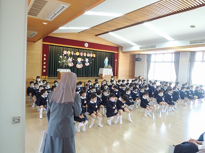 神様にお天気のお恵みをいただきマリア祭を行いました。いつも側にいて見守って下さっている、大好きなマリア様に感謝の気持ちを込めて、お祈りやお花をお捧げしました☆行列ではお花で囲まれたマリア様に、お友達が持って来てくれた花びらをプレゼントすることが出来ました♪これからもみんなでマリア様のような優しく温かい心で過ごしていきたいと思います♬