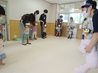 ぱんだ組は、お祈りや体操、室内遊びなど普段の様子を見てもらいました。子ども達は小さい手を上手に合わせお祈りをしたり、すべり台やマットで体を動かし楽しんでいました。ふれあい遊びでは、ペンギンバイザーを被りかわいいペンギンさんに変身!!「おさんぽペンギン」をお家の方と一緒にしてとても嬉しそうでした♪