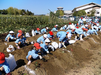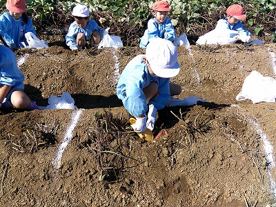 秋の心地良いお天気の中、年長組はみんなでお芋掘り遠足に行きました☆夢中になって土を掘り進めていく子ども達。土の中からお芋が顔を出すと嬉しそうな声が響きました!友達と力を合わせてお芋を掘り、自然の恵みに感謝しながら楽しい時間を過ごしました♬