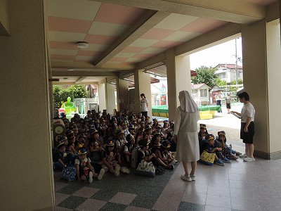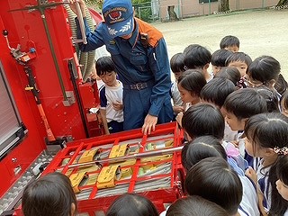 消防士の方に来ていただき、避難する姿を見て頂いたり避難する時の約束事をお話ししていただきました。大きくてかっこいい消防車を近くで見れて、大喜びの子ども達でした♪貴重な体験をさせて頂きましたね!