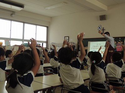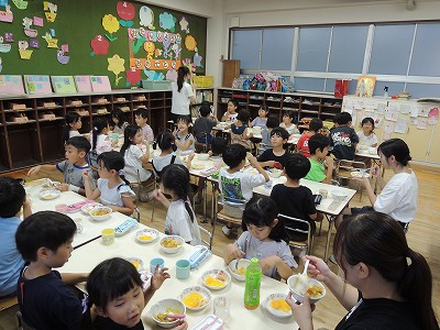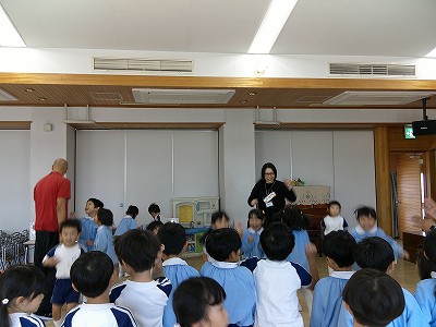 年長組は食育体験に参加しました。ライフの方に来ていただきDVDを観たりクイズをして食べ物や栄養バランスについて楽しく学ぶことが出来ました!これからも好き嫌いせず、たくさん食べて元気な体を作ろうね!☆