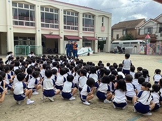 第五小学校で行われた交通安全教室に参加しました!小学校1年生と一緒に警察の方のお話を聞き、映像を見て交通ルールについて楽しく学びました。これからもみんなでルールを守って安全に過ごそうね♪